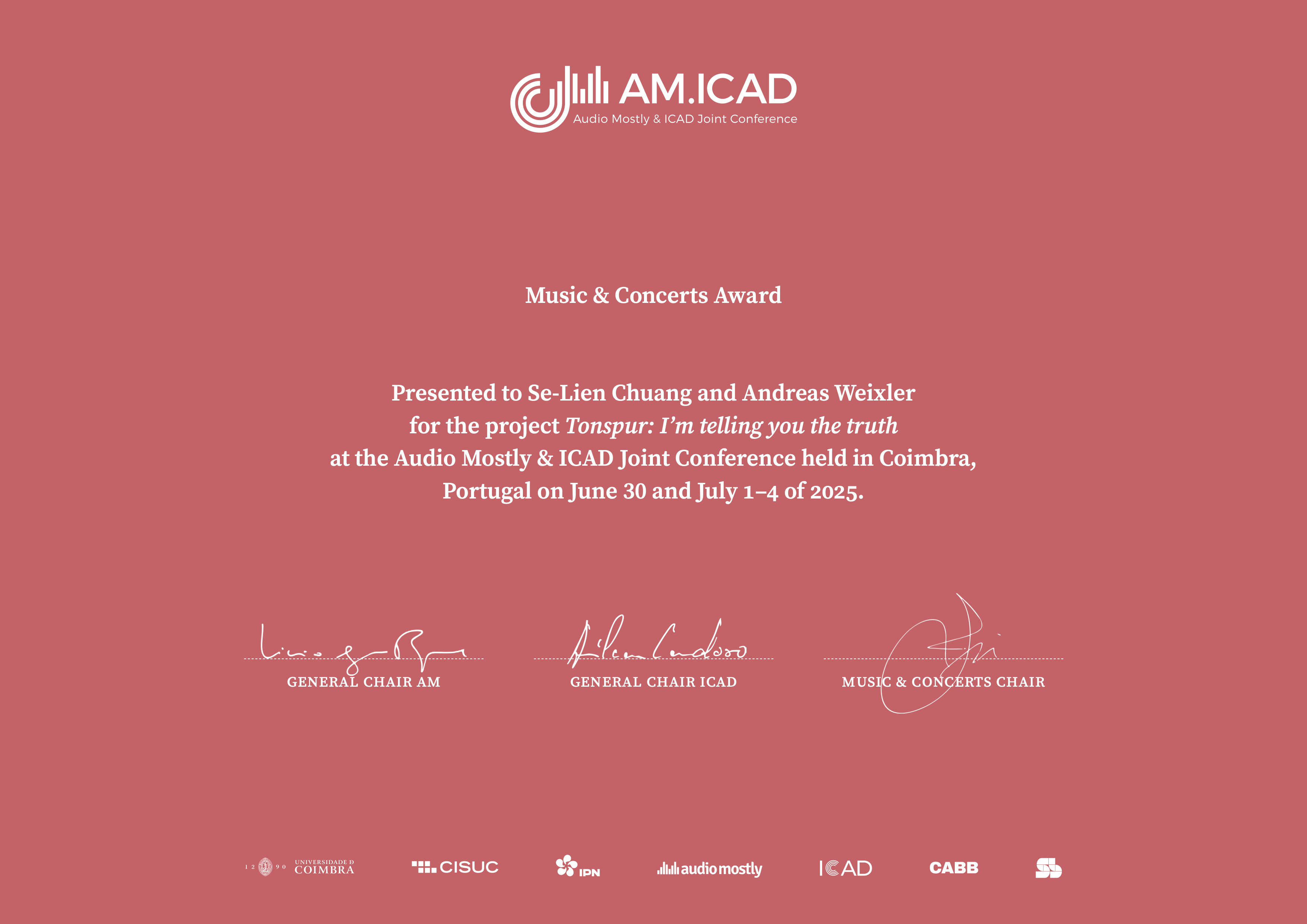 2025 ![]() AM.ICAD Music & Concert Award Audio Mostly & ICAD Joint Conference, Coimbra 2025 The latest interactive audiovisual work by Se-Lien Chuang and Andreas Weixler was awarded the AM.ICAD Music & Concert Award for best performance at the joint conference of Audio Mostly and ICAD – International Community for Auditory Display in Coimbra, Portugal (30 June – 4 July 2025). Tonspur: I'm Telling You the Truth von Se-Lien Chuang & Andreas Weixler im Salão Brazil, Coimbra, Portugal am 1. Juli 2025 Video mehr info ![]() ![]() Foto © Dimitris Menexopoulos Participation in this conference was made possible in part by a b-grant from the ABU ![]() International Computer Music Conference Boston, June 8 – 14, 2025 Tonspur: I’m Telling You the Truth Interactive Audiovisual Comprovisation for MCSS (Marble Ceramic Scenic Score) By Se-Lien Chuang & Andreas Weixler ![]() Performed by: Dan VanHassel, Electric Guitar Philipp Stäudlin, Saxophones Matt Sharrock, Percussion Se-Lien Chuang, Interactive Visuals, Vocal & MCS2 Andreas Weixler, Audio Real-Time Processing Participation in this conference was made possible in part by a b-grant from the ABU |