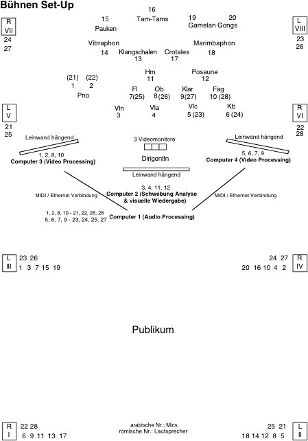Macintosh G4 & PC Computer, Mikrophone, 8-Kanal Lautsprechersystem, Projektoren, Mischpult, MIDI Interface, Audio- & Video-Interface und Max/msp, Jitter, PD, GEM, SuperCollider & div. Videoprogramme